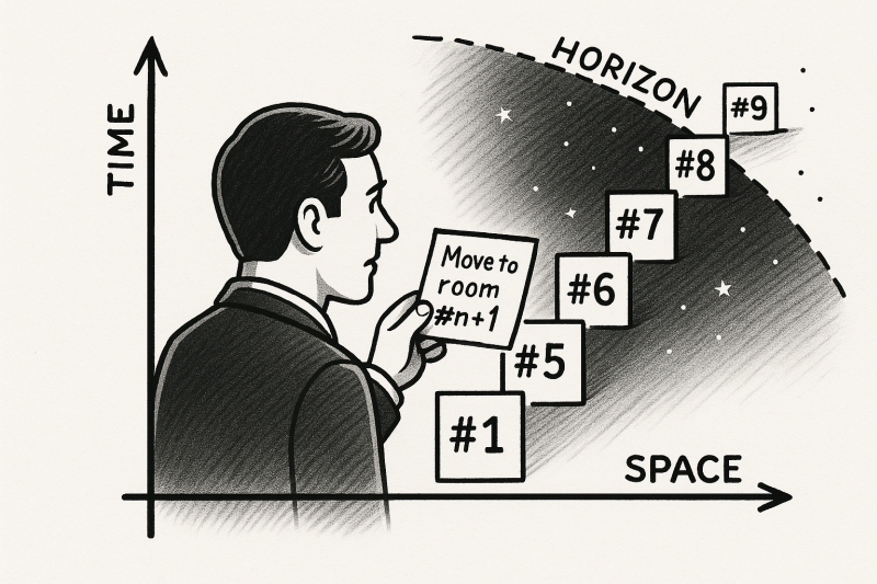 Hotel Hilberta działa w matematyce, ale w fizycznym wszechświecie - z ograniczoną prędkością światła, entropią, rozciągającą się czasoprzestrzenią - nie zadziała nigdy w pełni. Możemy mieć strukturę nieskończoną, ale niekomunikowalną. Systemy, w których informacja o zmianie nigdy nie dotrze do niektórych regionów. Granica n → ∞ staje się granicą poznania, nie tylko rozmiaru.