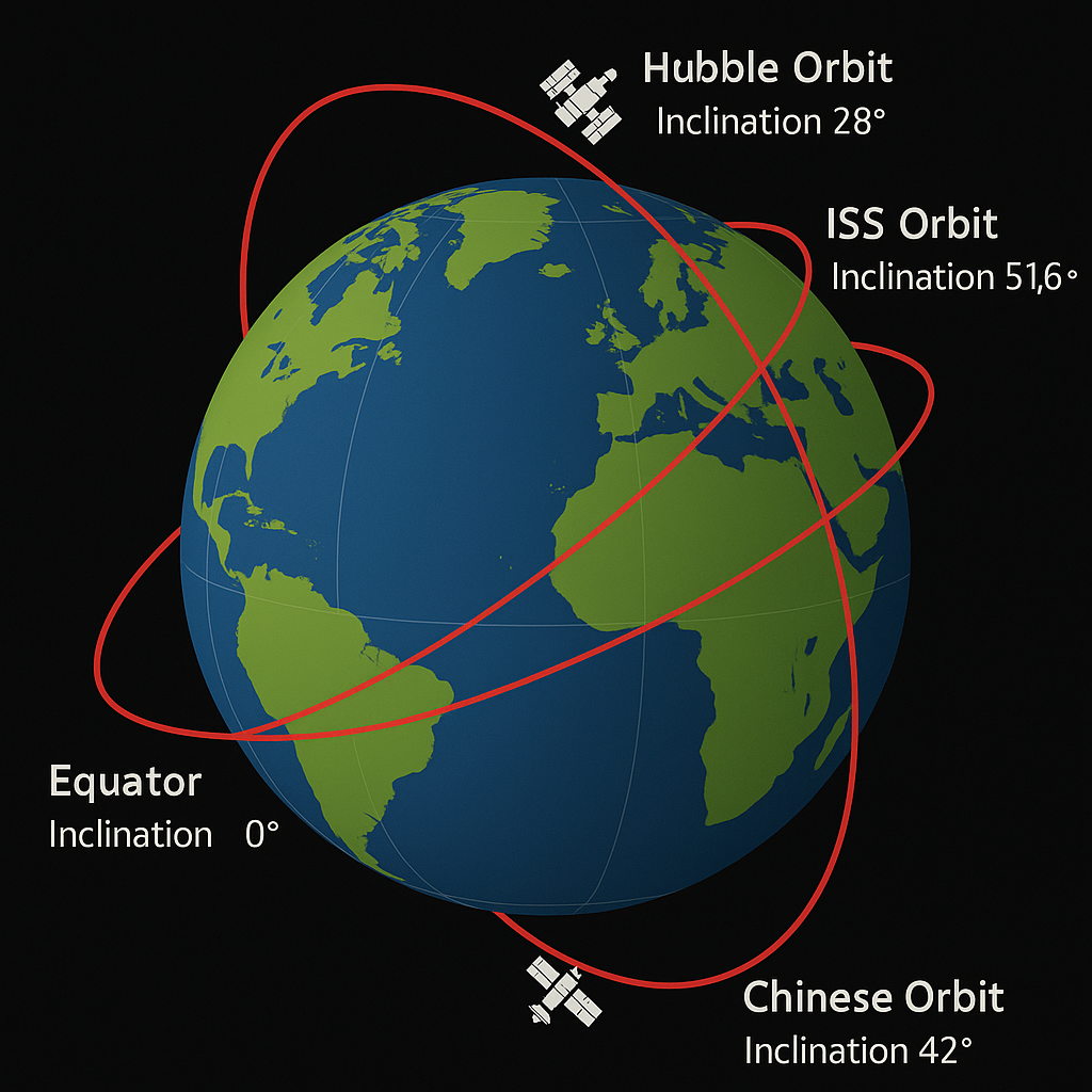 - Tiangong: ok. 42° (inna płaszczyzna niż ISS i Hubble).