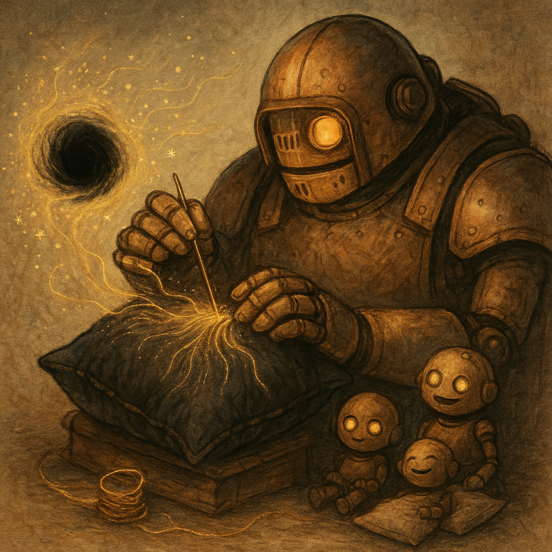 Z czasem Slav zauważył, że wokół dziury unoszą się delikatne, złote nici promieniowania. Były to tzw. "włosy Hawkinga" - szczątkowe informacje, które nigdy nie trafiły za horyzont zdarzeń. Slav zbierał je ostrożnie pincetą ze stali kwantowej i zszywał z nich poduszki. Miękkie, ciepłe i absolutnie niemożliwe do zrozumienia dla fizyki klasycznej.